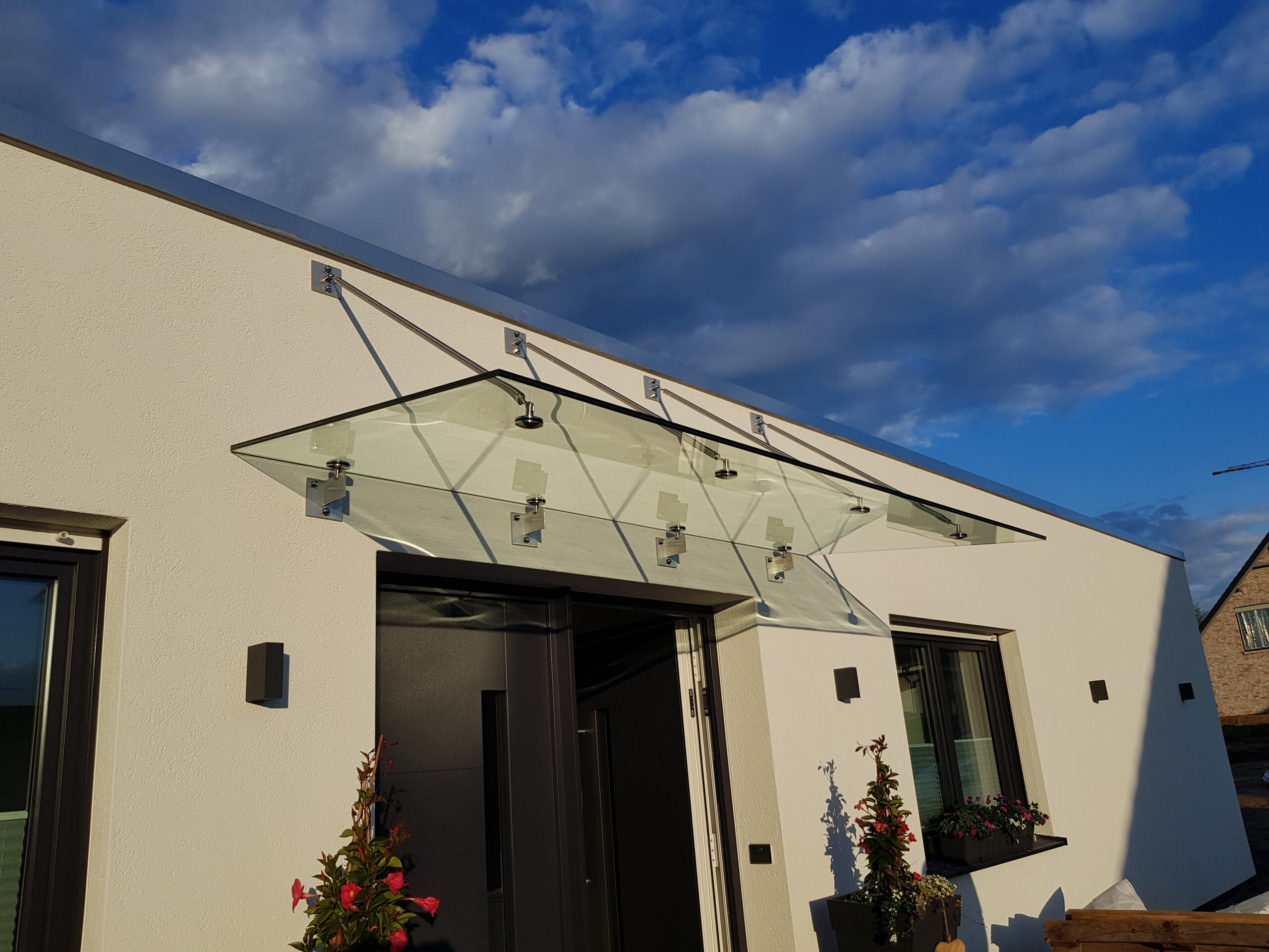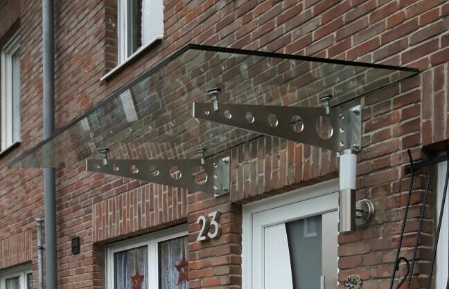 Verschiedenfarbige Gläser und hochwertige Elemente wie Edelstahlträger bieten hier die Möglichkeit, das Aussehen des Vordachs an den Stil des Gebäudes anzupassen und so für ein harmonisches Gesamtbild zu sorgen.